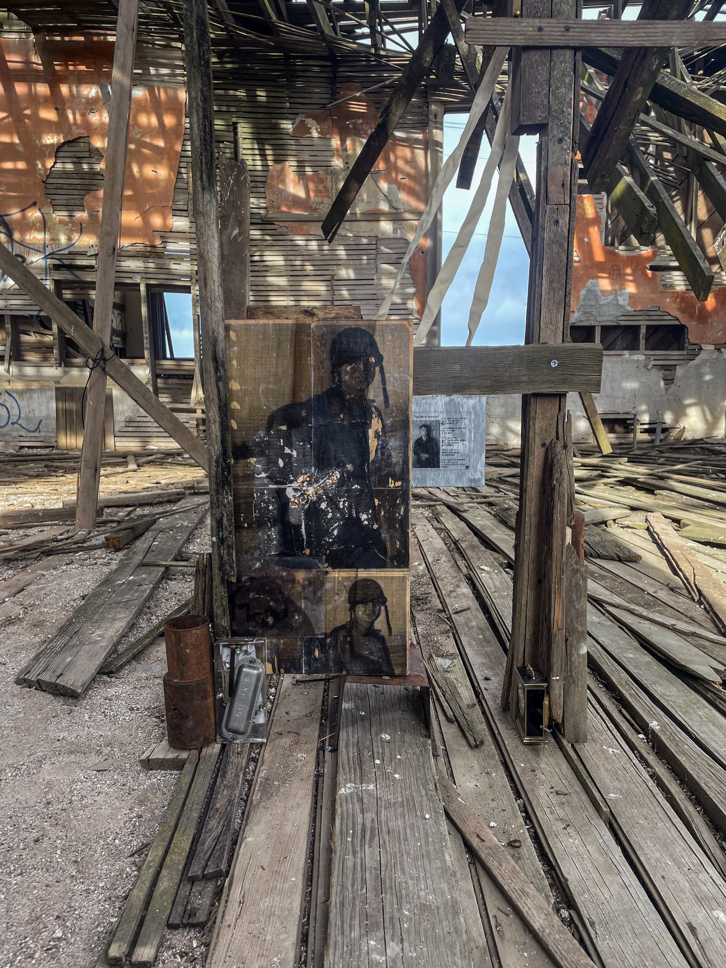 cast resin, image transfer on wood/textile/plexi, found objects, site salvaged wood, cotton twill
