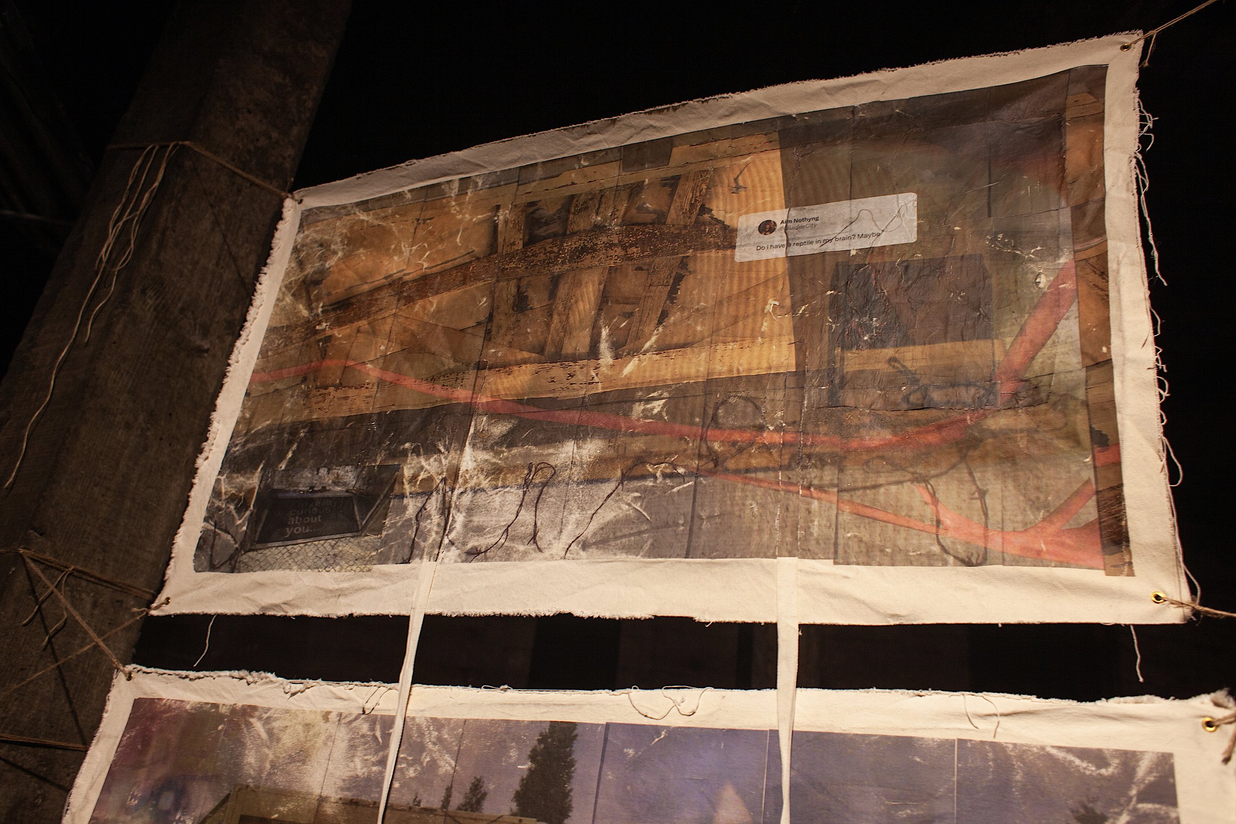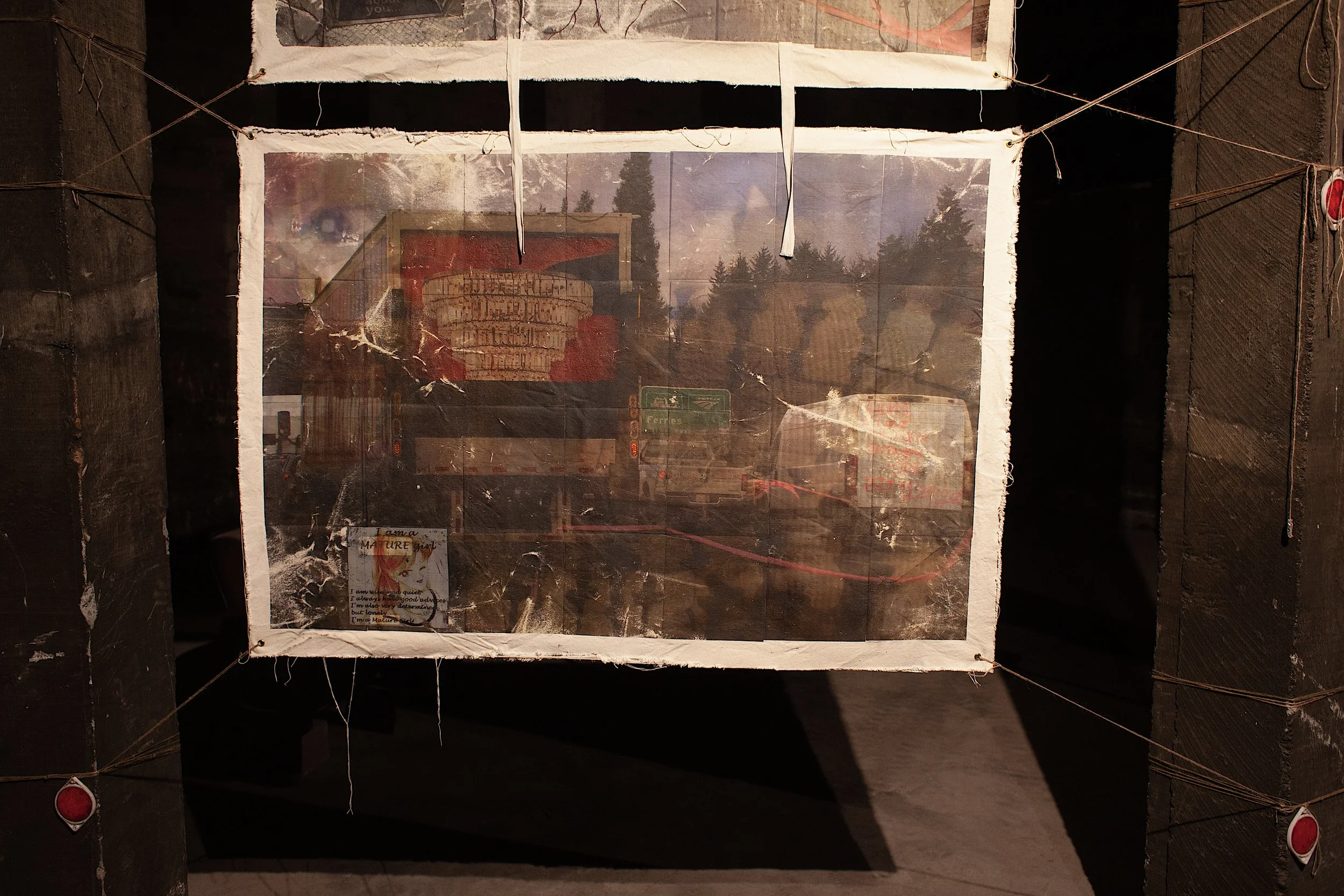 To begin this work, one must understand memetics and memory as mutable lines ingested and processed through a Rolodex of understood emotional and visual landmarks. An unrelenting digging is required to process such symbolism at a collective scale. The works of Williams and Whitaker mirror this exploration in both the function of their works and through the exploration of image as material. Representation of image by way of both projected and transferred, Williams and Whitaker explore the bounds of our collective interpretation of artifact and artifice. Creating visual chaos through layers, movement, and application, the importance of texture resonates throughout. Themes of ego, vulnerability, and escape recur throughout the works, emerging and receding through humor and sentimentality, as they aim to represent the psychological state of a generation inundated with information, trying to make sense of it, and seeing themselves reflected in much of it.